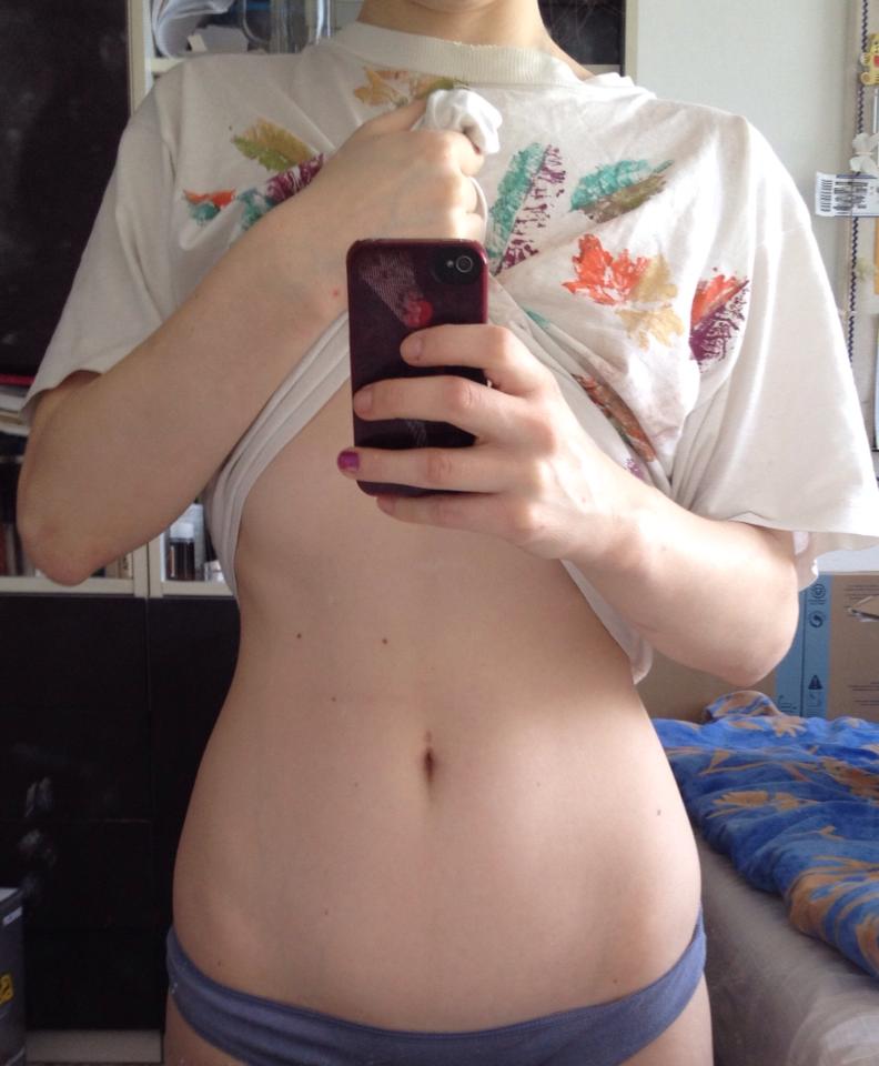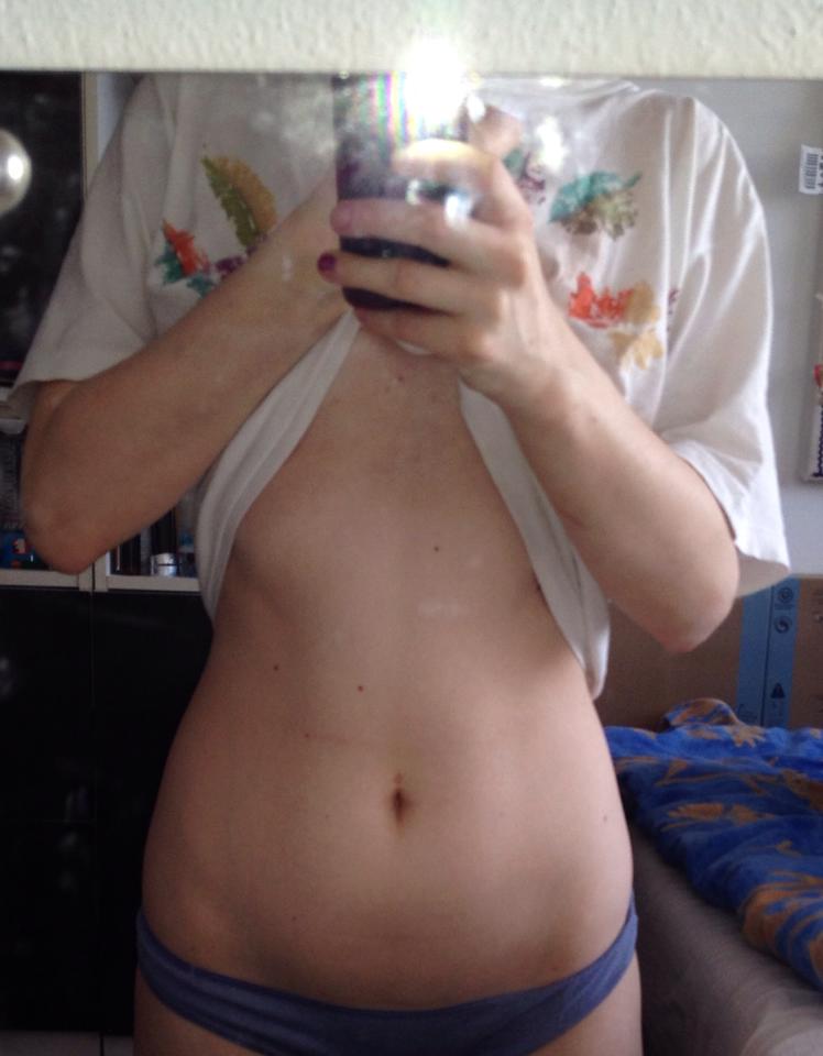 A co se týče dneška, podle Cvičebního plánu je tzv. STATurday, což je den, kdy si máme přeměřit míry. Nicméně jsem se rozhodla, že to nechám až na zítřek, kdy dojede Tom, a přeměříme se oba, nafotíme nějaké ty fotky, a já to pak lupnu sem na stránky. Navíc jsem doslova přežraná, takže by byly míry zkreslené. 🙂 A jak to vlastně šlo Tomovi? Dneska prý necvičil, protože běhal dvě hodiny na floorballe (budiž mu odpuštěno, stále má však restík ze středy), ale včera prý dal podle plánu obě cvičení, jedno ráno a druhé večer. Jestli tomu tak bylo, či nikoliv, prozradí zítřejší přeměřování a fotografie. Já vám sem dám alespoň fotografie svého břicha, které jsem nafotila dnes.