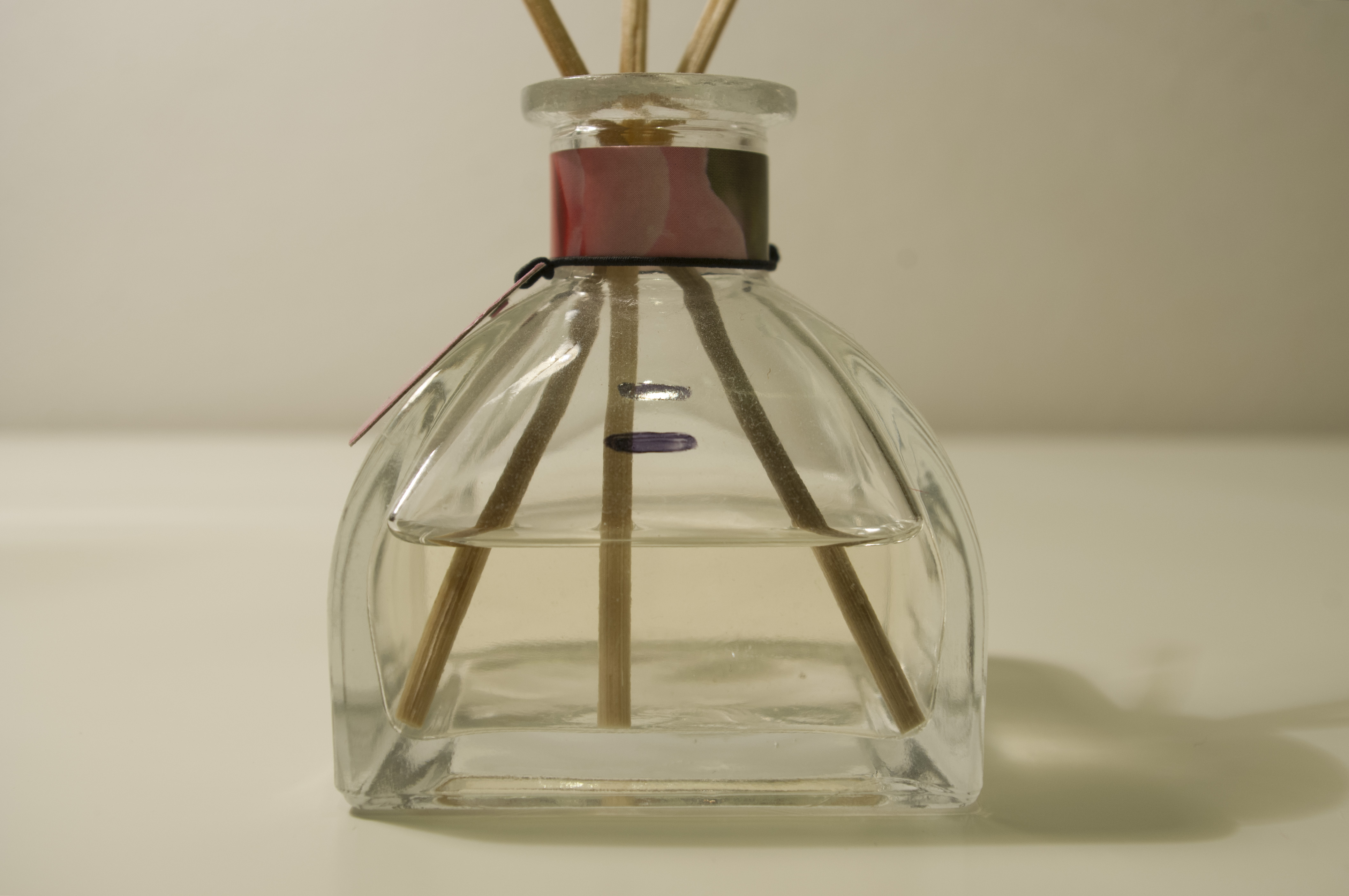 Na další fotografii můžete ještě vidět, kolik celkově ubylo z flaštičky aromatického oleje PartyLite. Je však třeba brát ohled na to, že dříve jsme měli tyčinky přímo v té flaštičce, po doporučení jsme však olej přelili do vázičky. Důvod byl prostý, v případě, že tyčinky strčíte přímo do flaštičky, olej prý ubývá rychleji.