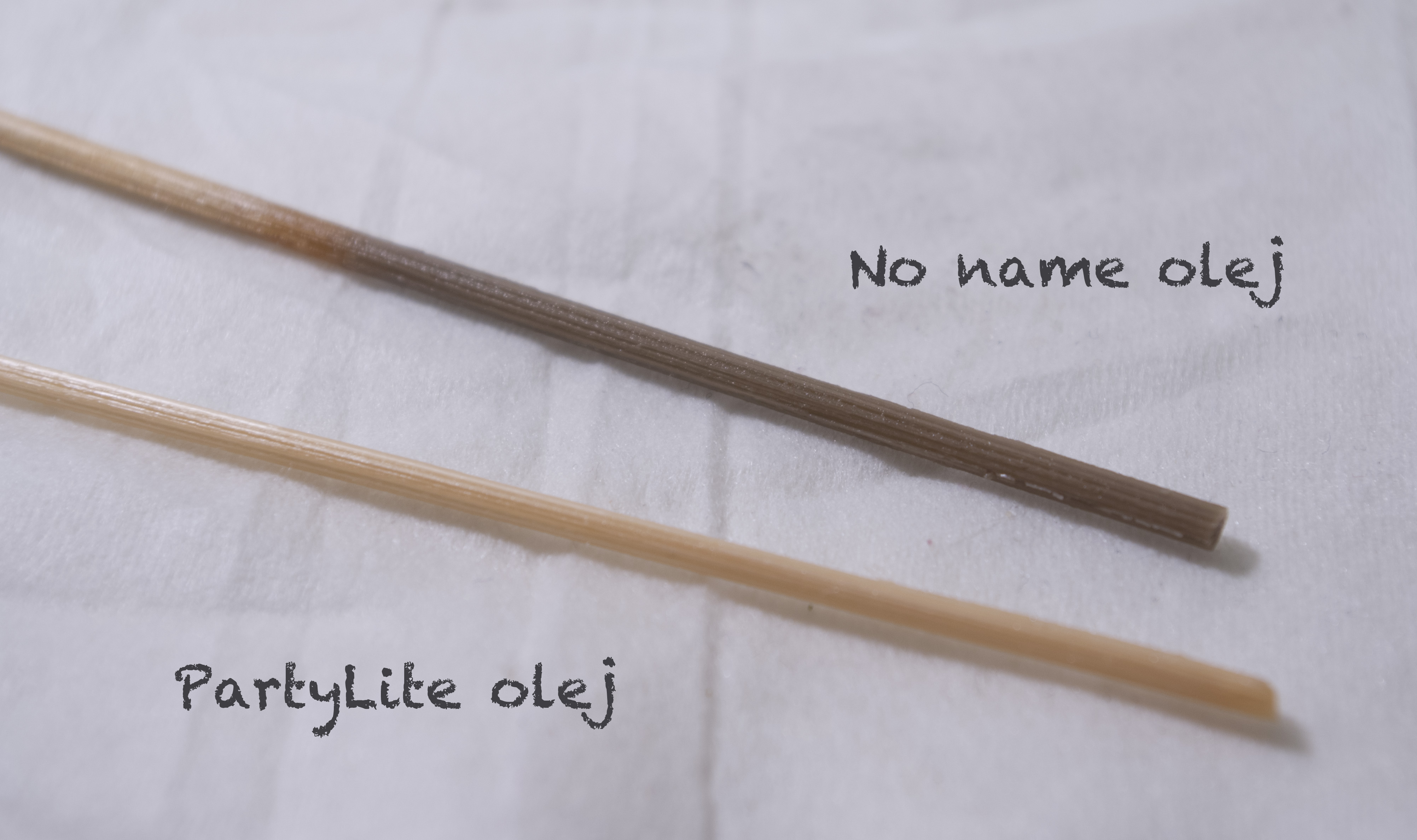 Než toto mini srovnání ukončím, ještě věnuji pozornost tyčinkám. Jak můžete z obrázků výše vidět (a jak jsem již zmiňovala), tyčinky u No name oleje jsou kratší, navíc taky poněkud “křivé” a z pochybného materiálu. A k mému velkému překvapení namočené části špejliček zešedly (resp. byly takové špinavé). A vypadá to docela… No, prostě je to fuj.